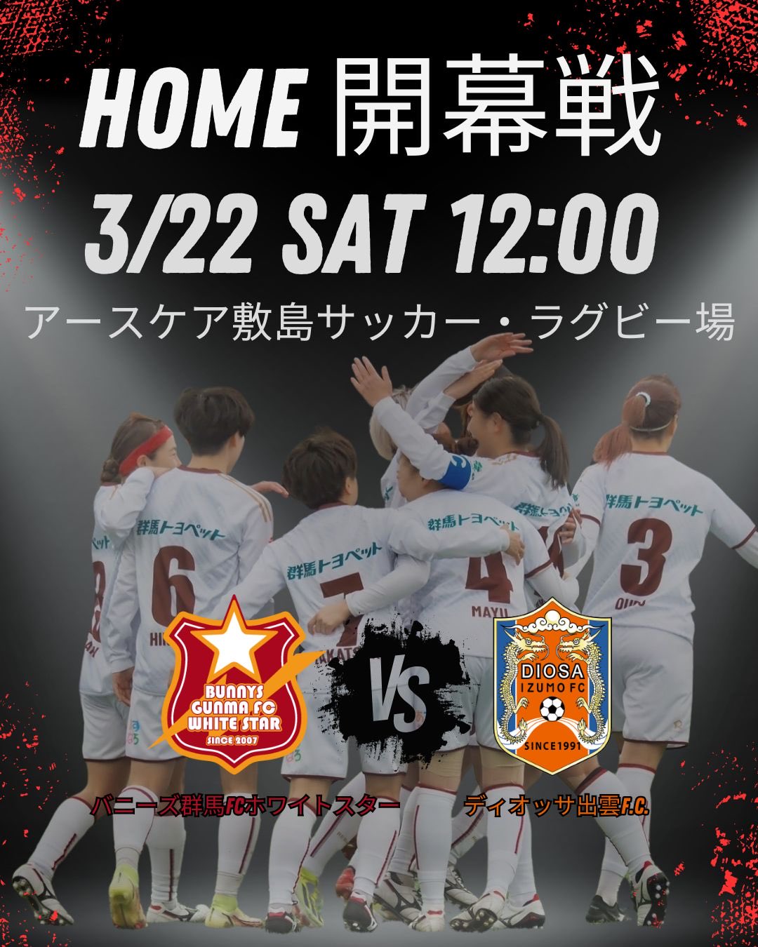 3月22日に開催します2025プレナスなでしこリーグ2部 第2節 ディオッサ出雲FC戦についてお知らせします。この試合はバニーズ群馬FCホワイトスターのホーム、アースケア敷島サッカーラグビー場にて観戦無料で開催します。先着300人に開幕記念オリジナルTシャツの無料配布、群馬特使アイドルあかぎ団メンバーによるキックインセレモニーなどイベントも盛りだくさんです。