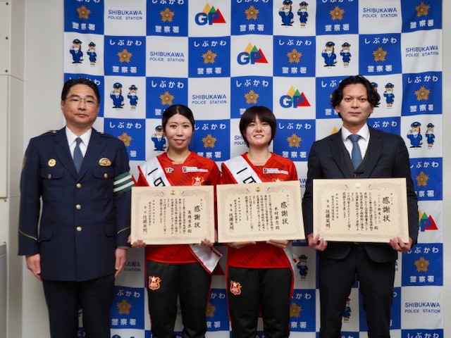 春の全国交通安全運動(4月6日〜4月15日)の初日4月6日(日)、トップチームで群馬県出身の高橋 杏奈 選手と木村 華恋 選手が渋川警察署長より1日警察署長を委嘱されました。佐藤 英明 署長と渋川交通安全協会の皆様とフレッセイ榛東新井店様で街頭指導を行いました。