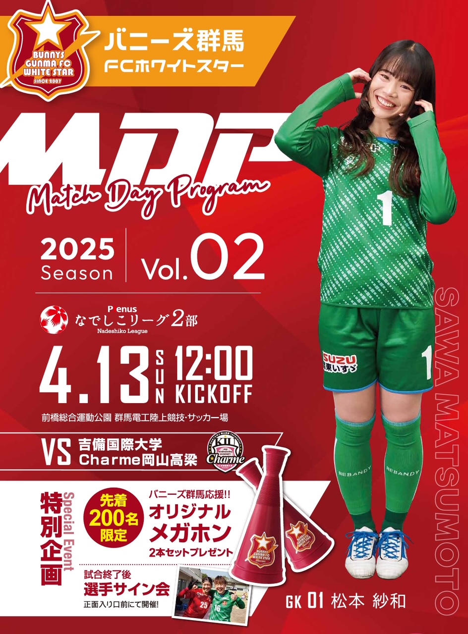 4月13日に開催します2025プレナスなでしこリーグ2部 第5節 吉備国際大学Charme岡山高梁 戦についてお知らせします。この試合はバニーズ群馬FCホワイトスターのホーム、前橋総合運動公園 群馬電工陸上競技・サッカー場にて観戦無料で開催します。先着200人にオリジナルメガホンセットを無料配布します。