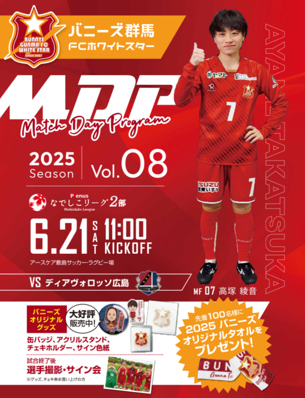 6月21日に開催します2025プレナスなでしこリーグ2部 第16節 ディアヴォロッソ広島 戦についてお知らせします。この試合はバニーズ群馬FCホワイトスターのホーム、アースケア敷島サッカー・ラグビー場にて観戦無料で開催します。先着100名にバニーズ群馬マフラータオルを無料配布します!