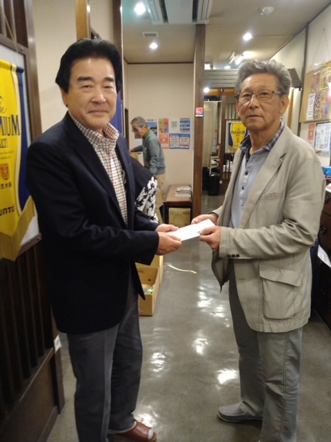 五十嵐社長(右)から浄財の贈呈を受ける谷村代表⇓